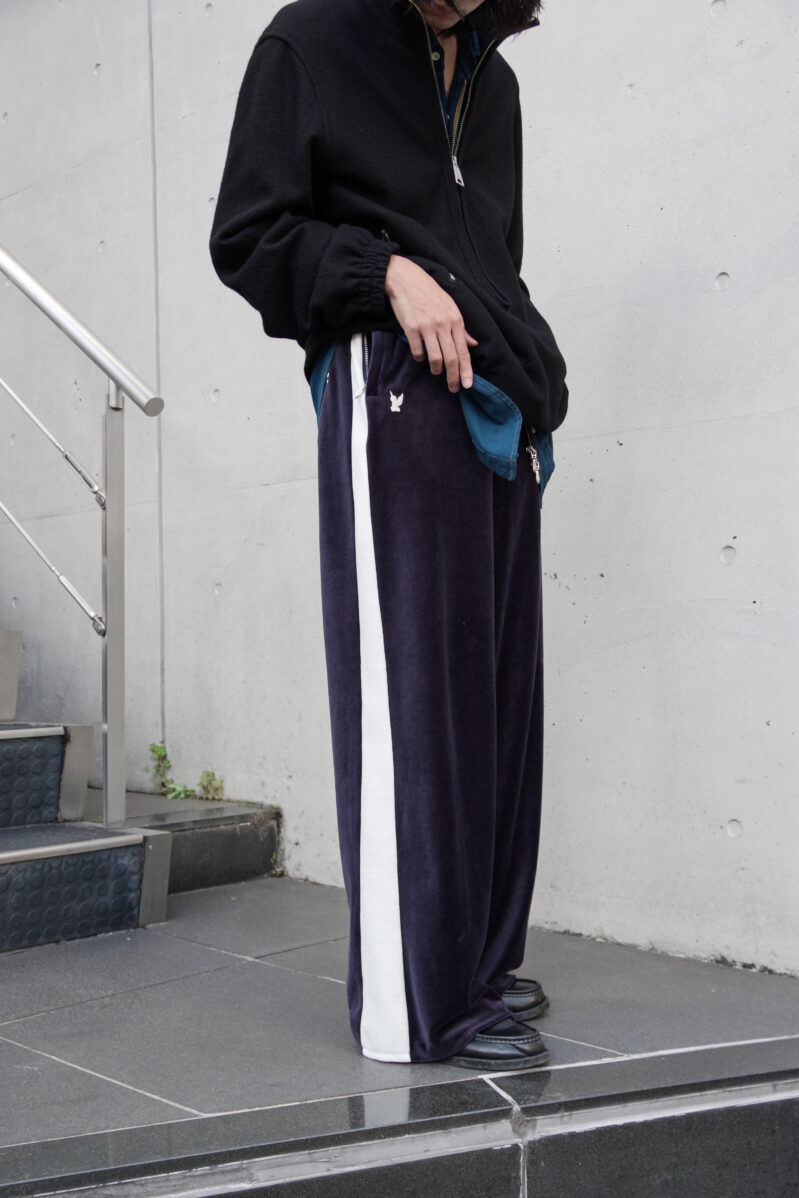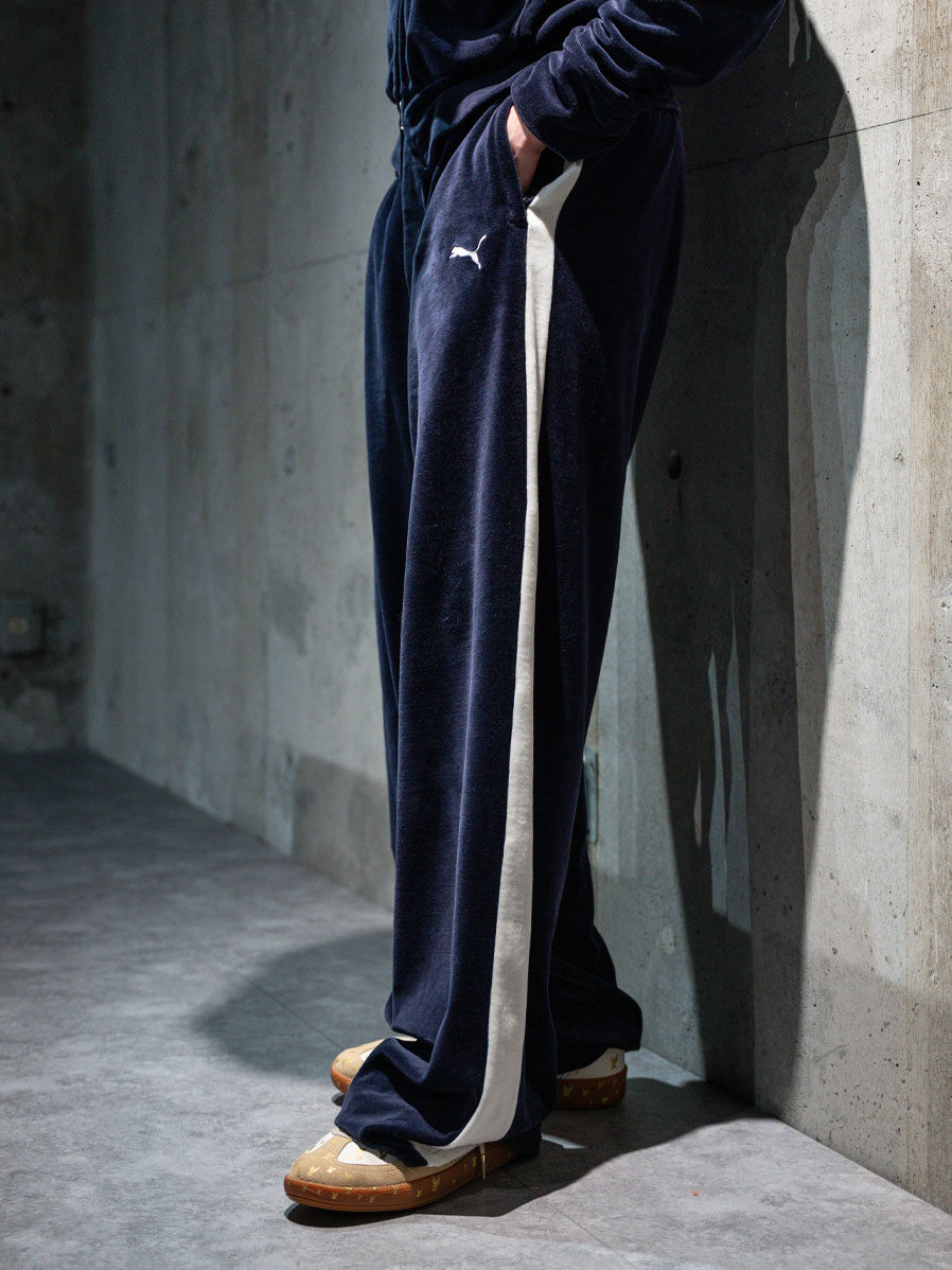 トラックパンツでありながらベロア生地を用いることで、スポーティでありながら