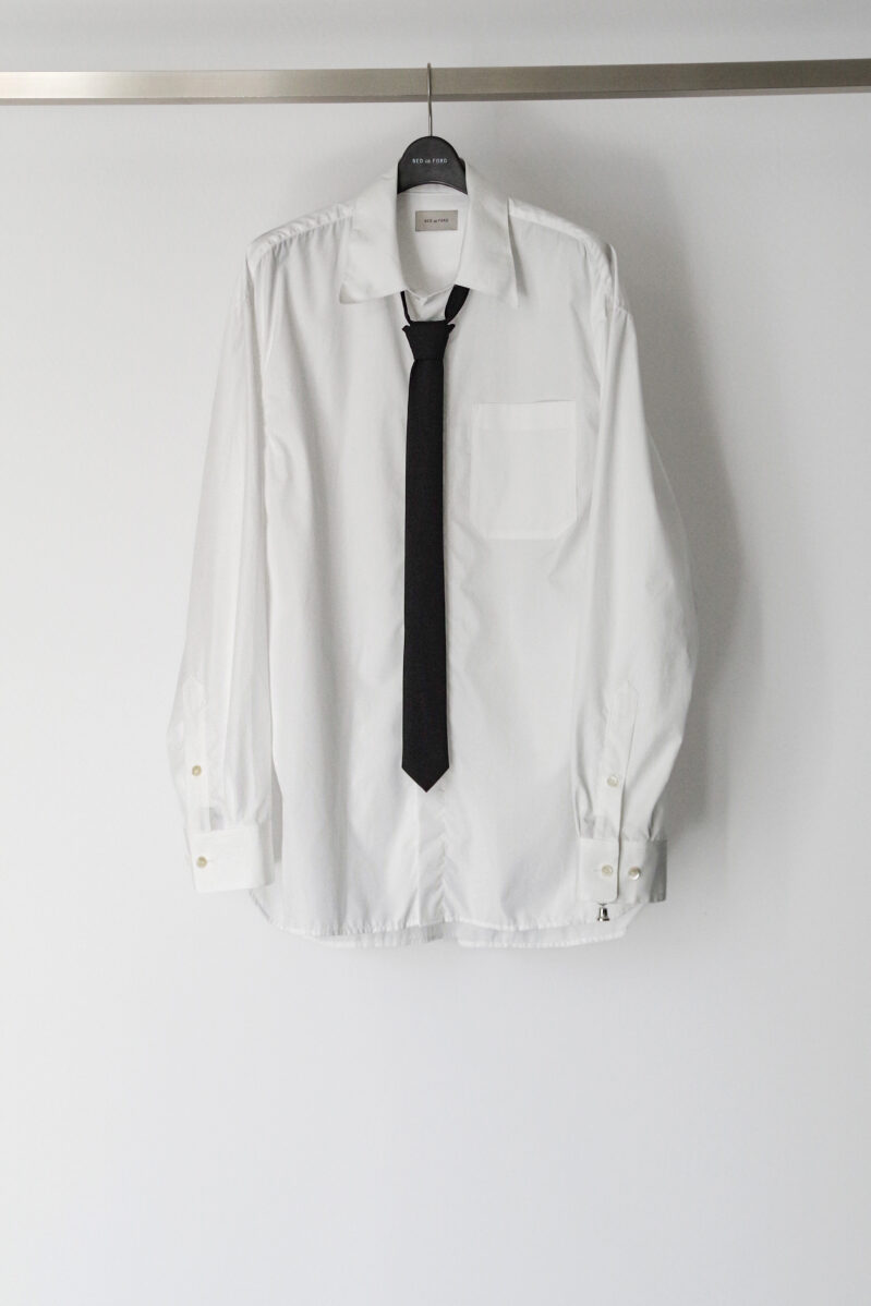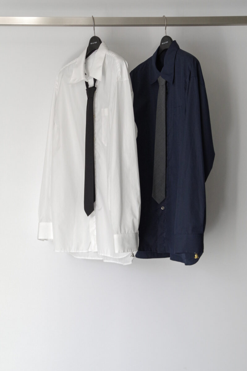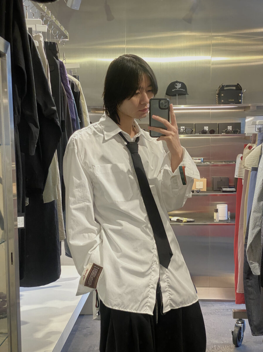 このシャツの魅力は最高峰に美しいシャツをこれでもかと言うほど力を抜いて着ることで生まれる新たな価値観、ブランドが前シーズンから掲げている “Alternative Elegance” 、決まりきったエレガンスに反することの美学を反映したシャツです。