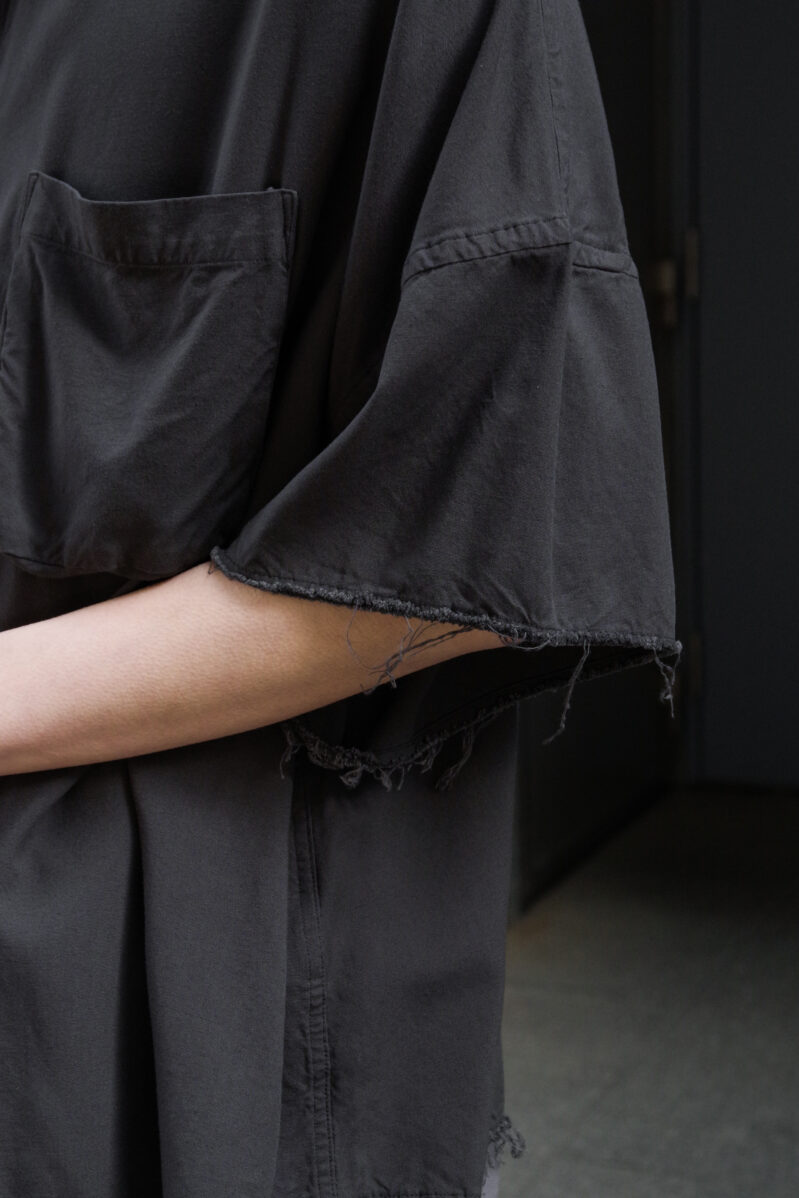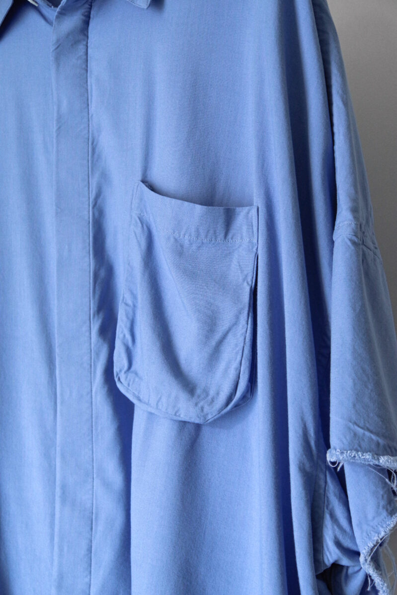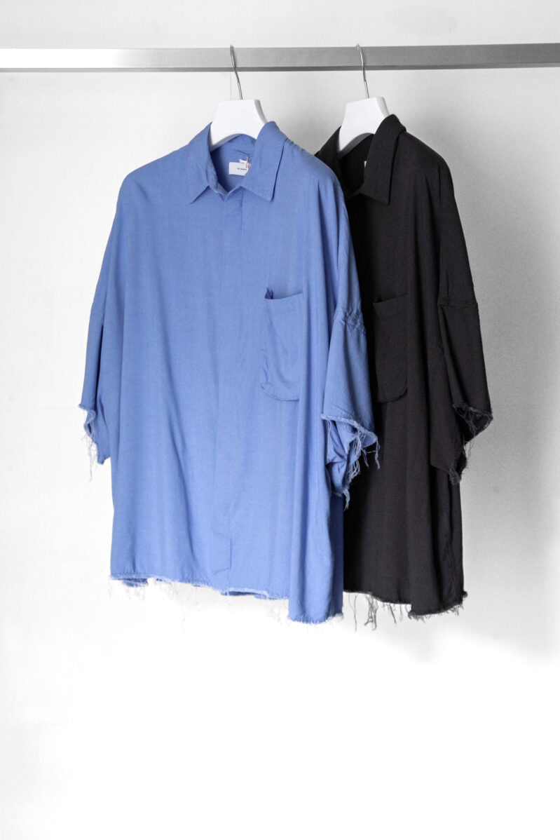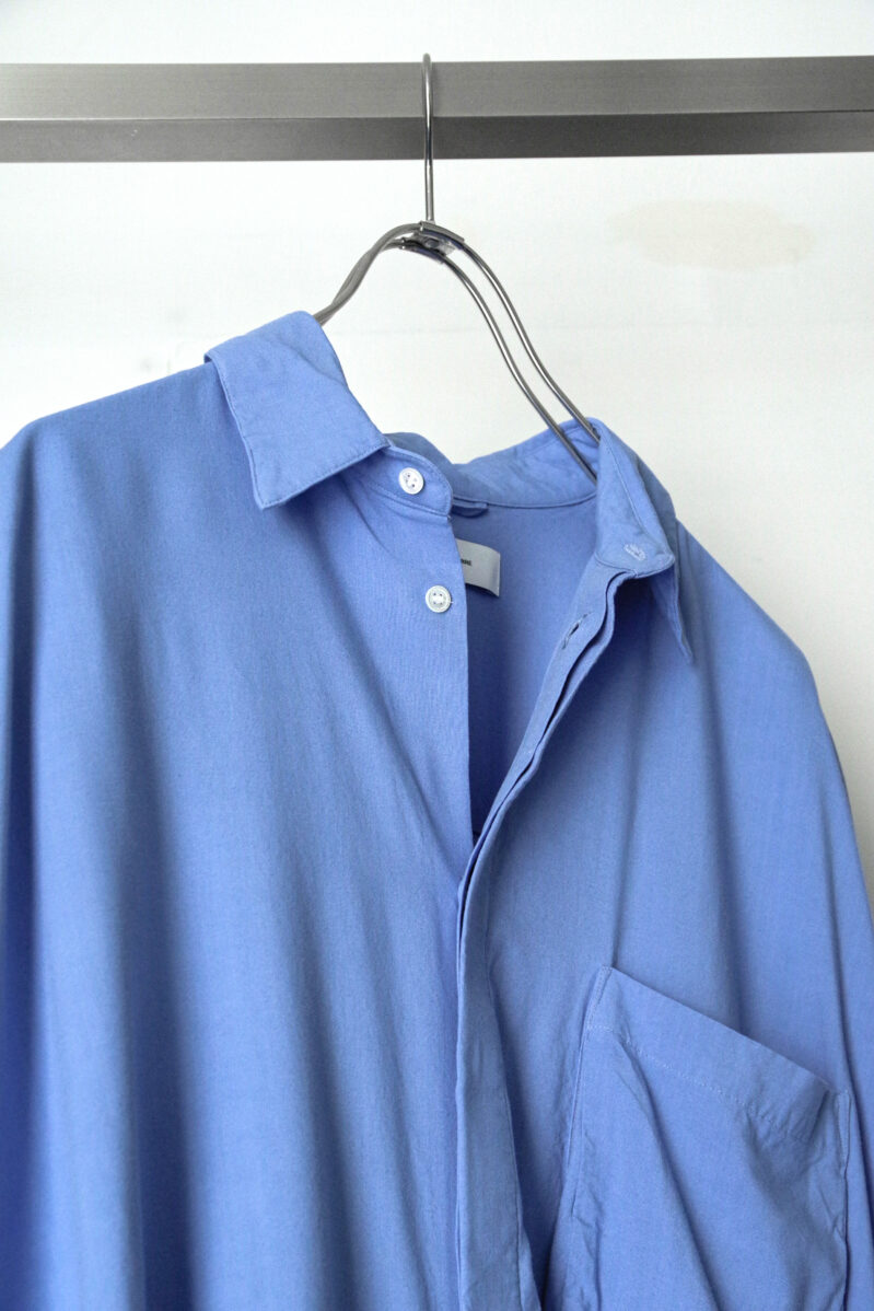 レギュラーのシャツと比較して極端にビッグサイズに仕上げており、着丈でバランスを取って仕上げた1着はユニークな発想の中に、優れたパターンメイキングが詰まったプロダクト。
