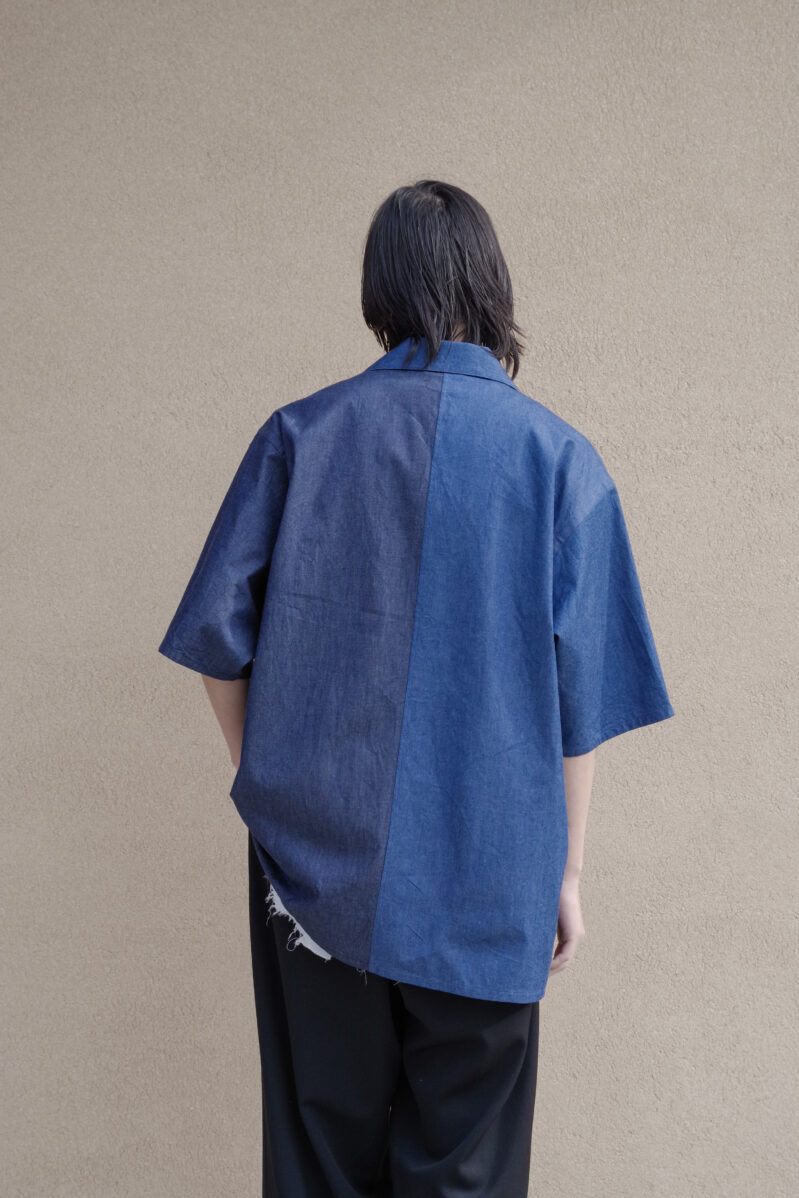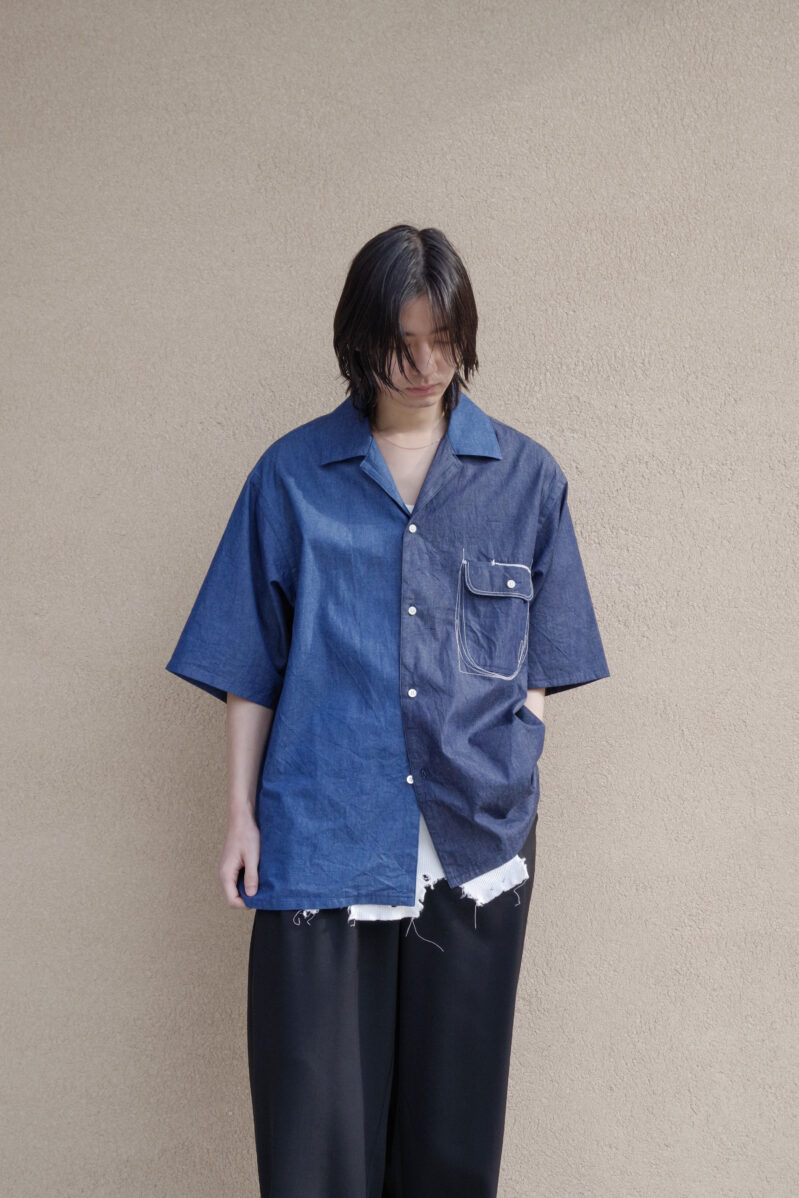 EMAMらしさを感じるアシンメトリー×ステッチのデニムシャツ。