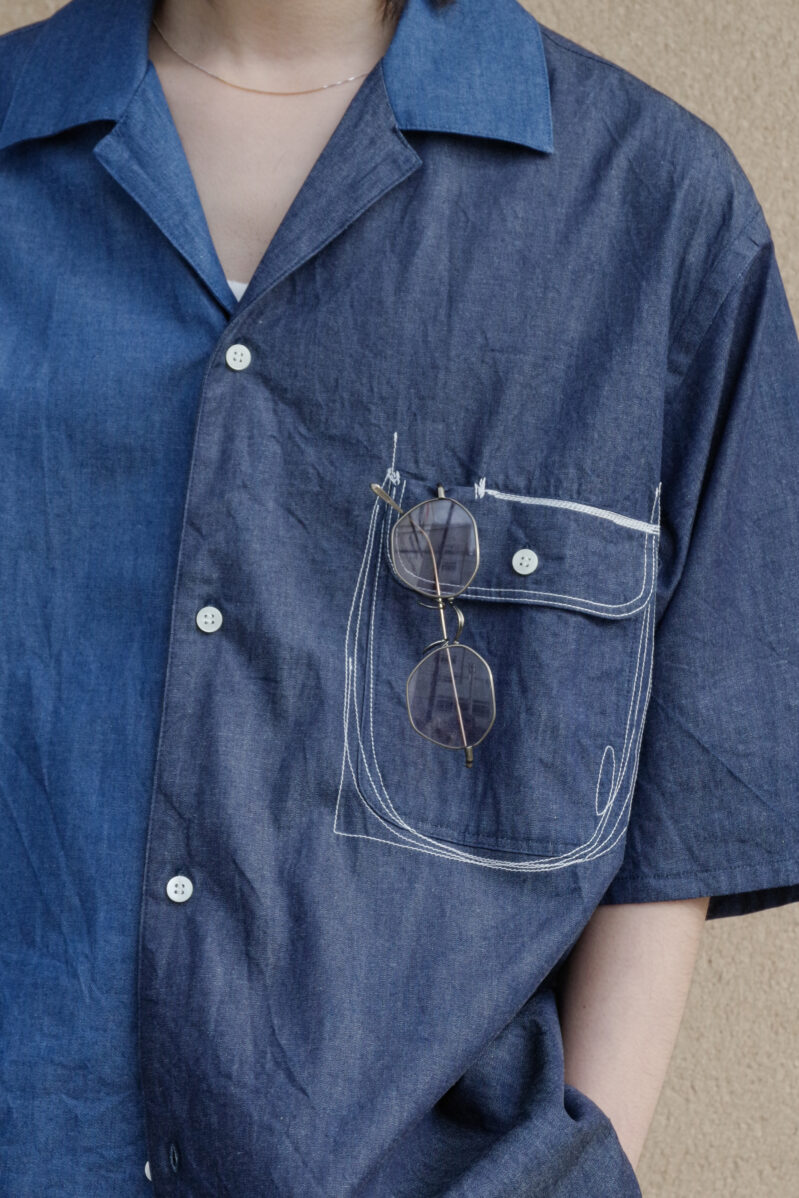EMAM “Design stitch open collar shirt” – INDIGO DENIM