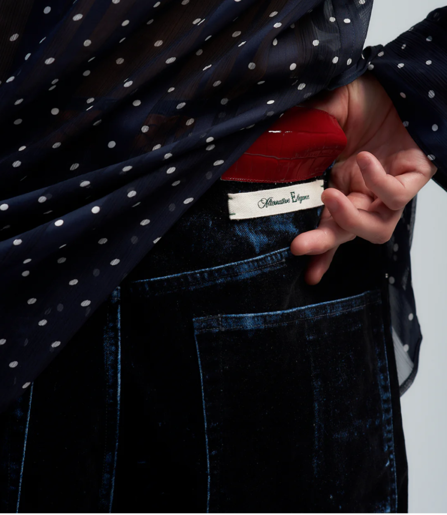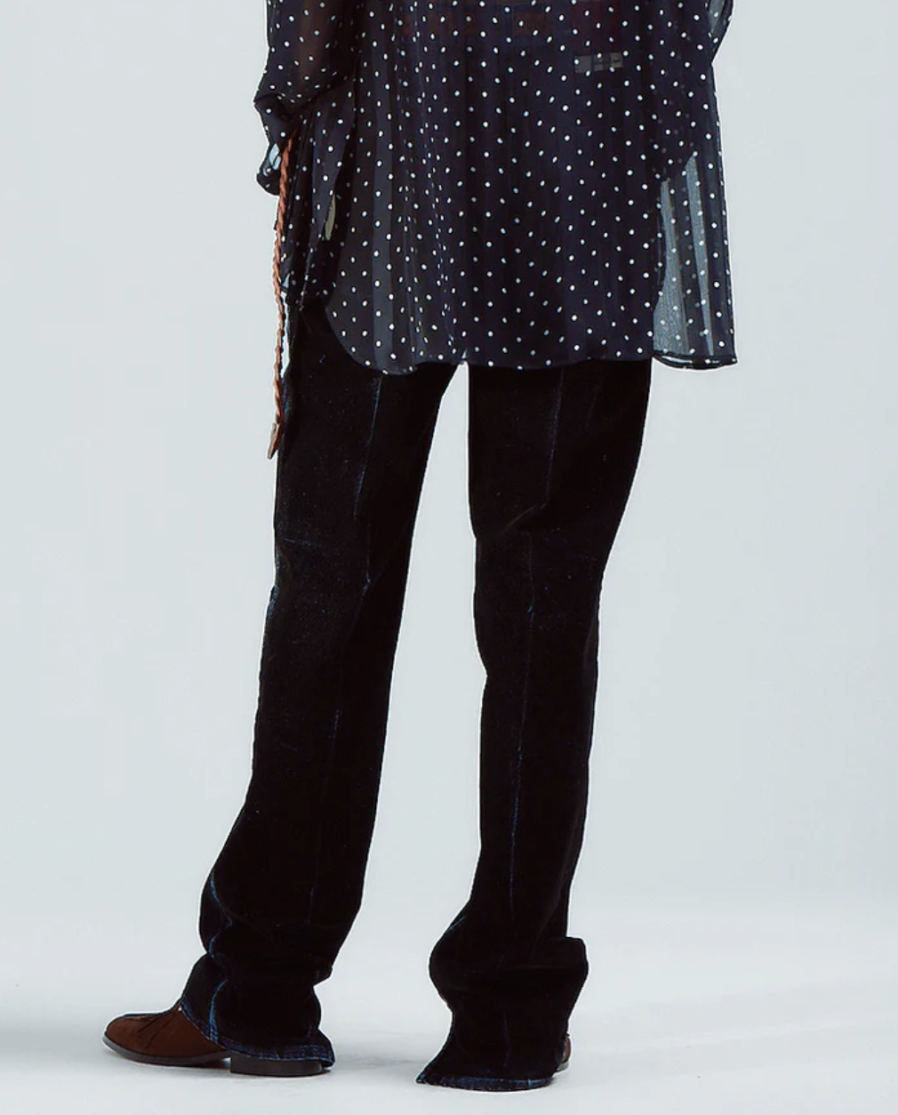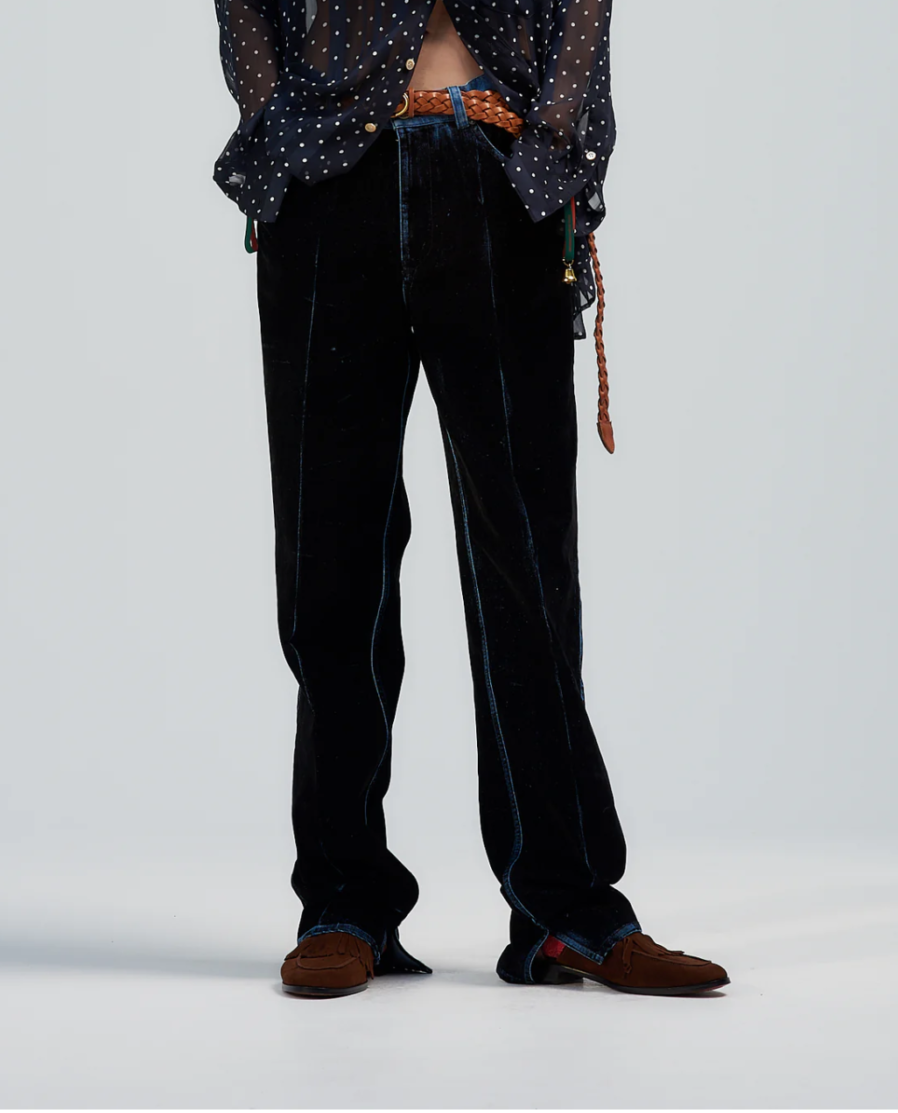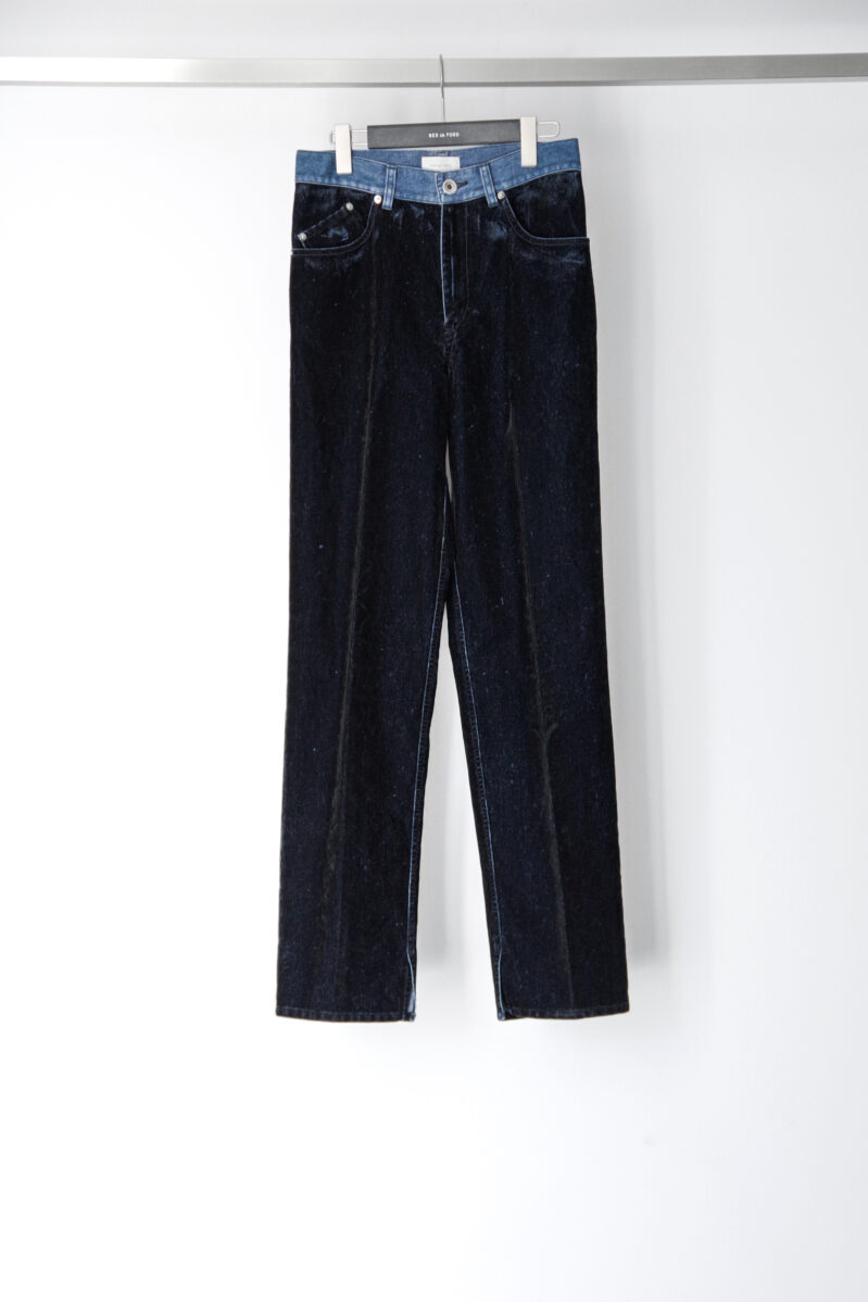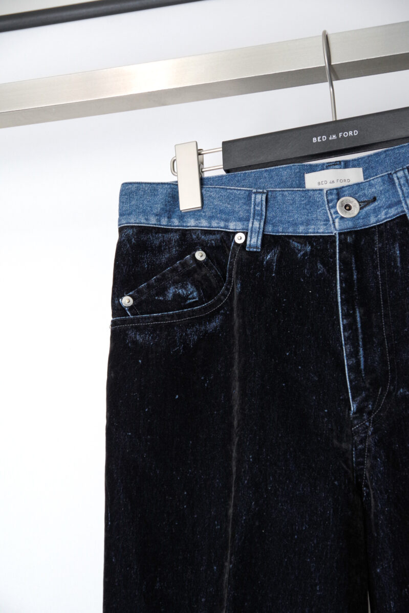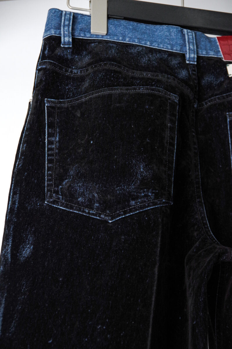 一見するとベルベットのような質感、しかし所々に施された経年で削れたような表面からはデニム生地が見え隠れする。